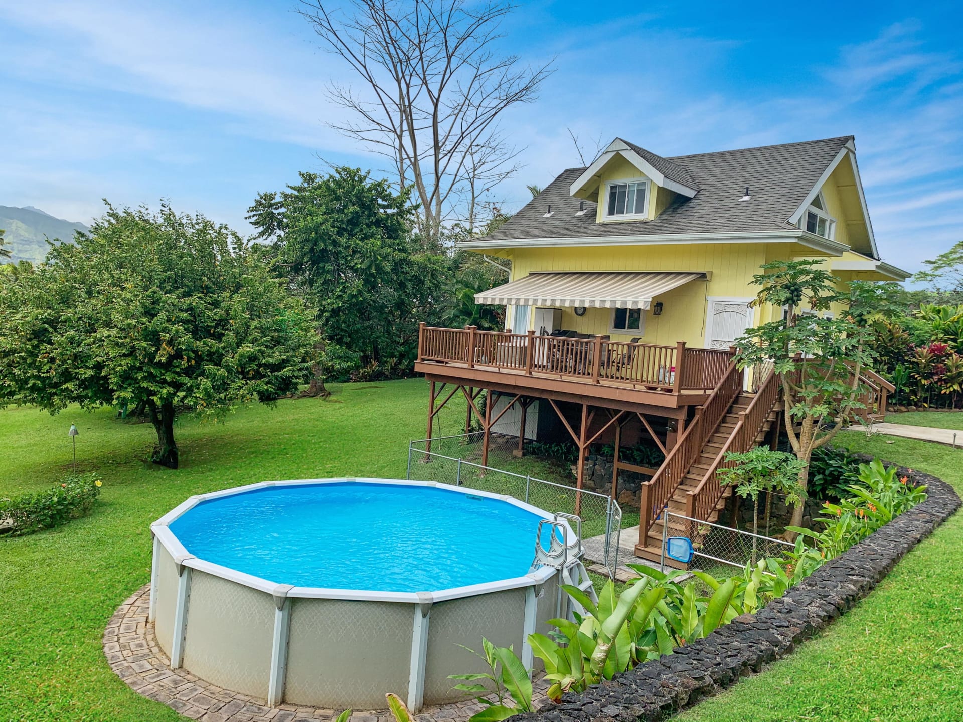 Kauai Real Estate Update- I just sold a 2 bedroom 1.5 home in the Wailua Homesteads and this property literally felt like it was on a movie set. This sweet little yellow house is located on 1.40 areas of land and the mountain views are heavenly. The property gently sloops down and at the very end is a stream, lots of lush green lawn too. It has an above ground pool and a massive outdoor dining area. The property is off of Kamalu Road up a long driveway, you’d never know this gem was there. My buyers bought it for $850,000 (cash) and it was only on the market for 2 days, lots of offers so I’m just thrilled for my buyers on their successful purchase of this completely charming home and property.