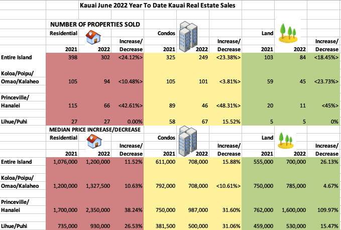 Kauai Real Estate Year To Date 2022 vs 2021