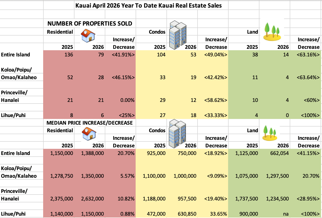 Kauai Real Estate Year-To-Date 2025 vs 2026