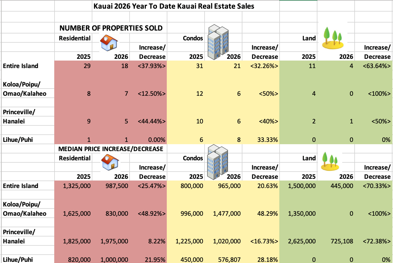Kauai Real Estate Year-To-Date 2026 vs 2025