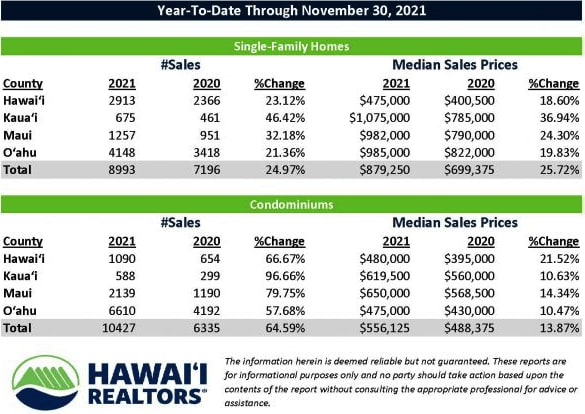 Oahu saw un uptick in the number of sales for Homes 21.36% and condos at a whopping 57.68%. Prices are up as well for both; For a home $985,000 at the end of November 2021 compared to last year at $822,000. For condominiums $475,000 compared to $430,000 in 2020.