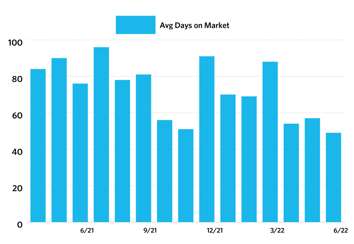 The average Days on Market (DOM) shows how many days the average property is on the market before it sells. The downward trend indicates a move towards more of a Seller’s market. While some of the previous 12 months have been outliers, the overall trendline shows that Days on Market is decreasing. Q2 2022 reported an average number of days on the market as 53 DOM, a decrease of -36% compared to 83 DOM Q2 2021.