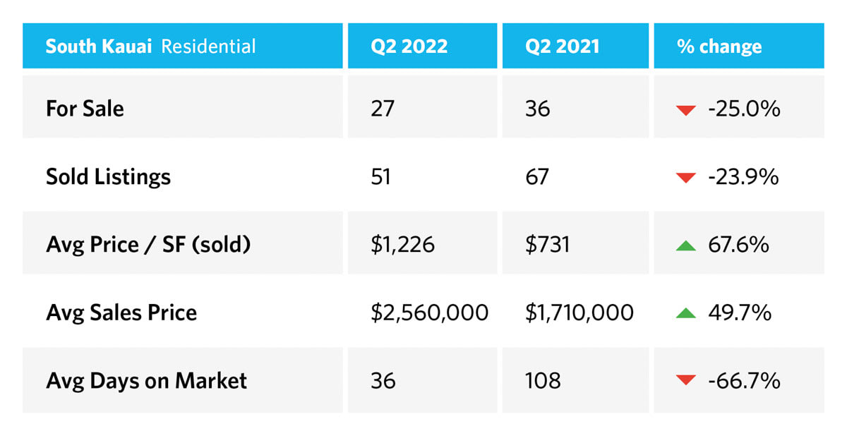 For Kauai, the average price per square foot has shown a steady increase over the last 12 months, with the year over year increase growing to $1,076/foot at the end of June 2022, an increase of 16.6% comparing Q2 2022 to Q2 2021.