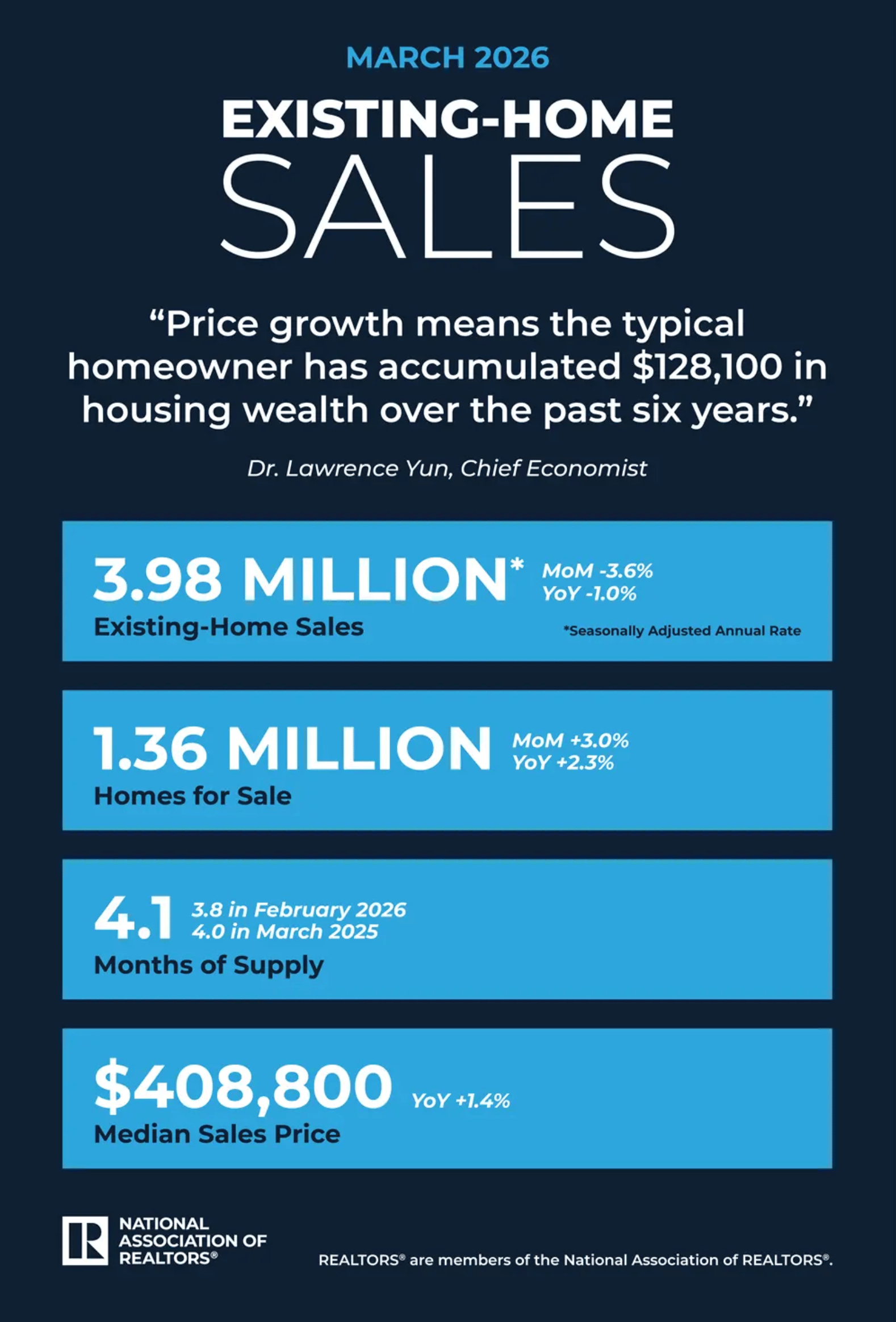 The Chief Economist for the National Association of Realtors has released his take on the housing market along with data comparing the first quarter stats for 2026 compared to 2025.