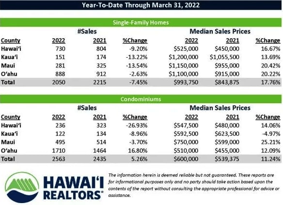 Oahu, Maui and Big Island Real Estate Year To Date 2021 vs 2022