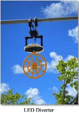 Known as “diverters” these come in both an LED and a Reflective style, both are meant to catch the attention of our endangered seabirds so they don’t fly into the power lines. These devices have no electronic output and they don’t collect any data. They glow in the dark and have been effective in preventing our Shearwaters and other seabirds from flying into the power lines.