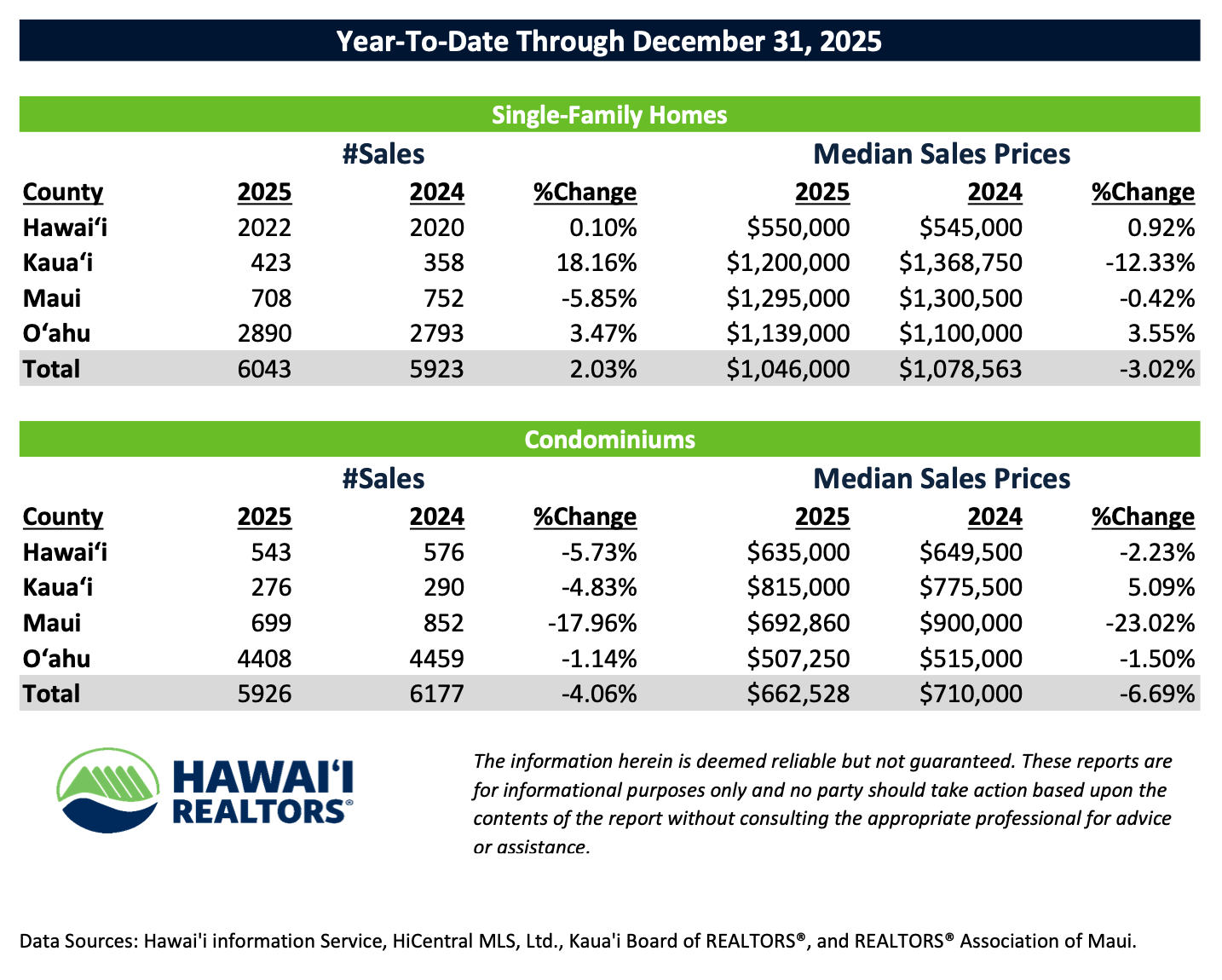 2025 was tumultuous and this impacted real estate on a National level. The smoke has cleared and we have the year end numbers for Oahu, Maui and the Big Island.