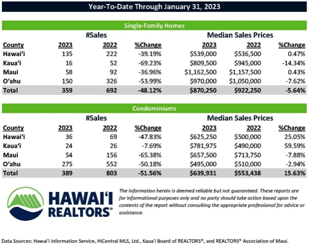 Last week I gave an update on the Kauai real estate market comparing the end of Janaury 2022 vs 2023.  This week we’re looking at the other islands.