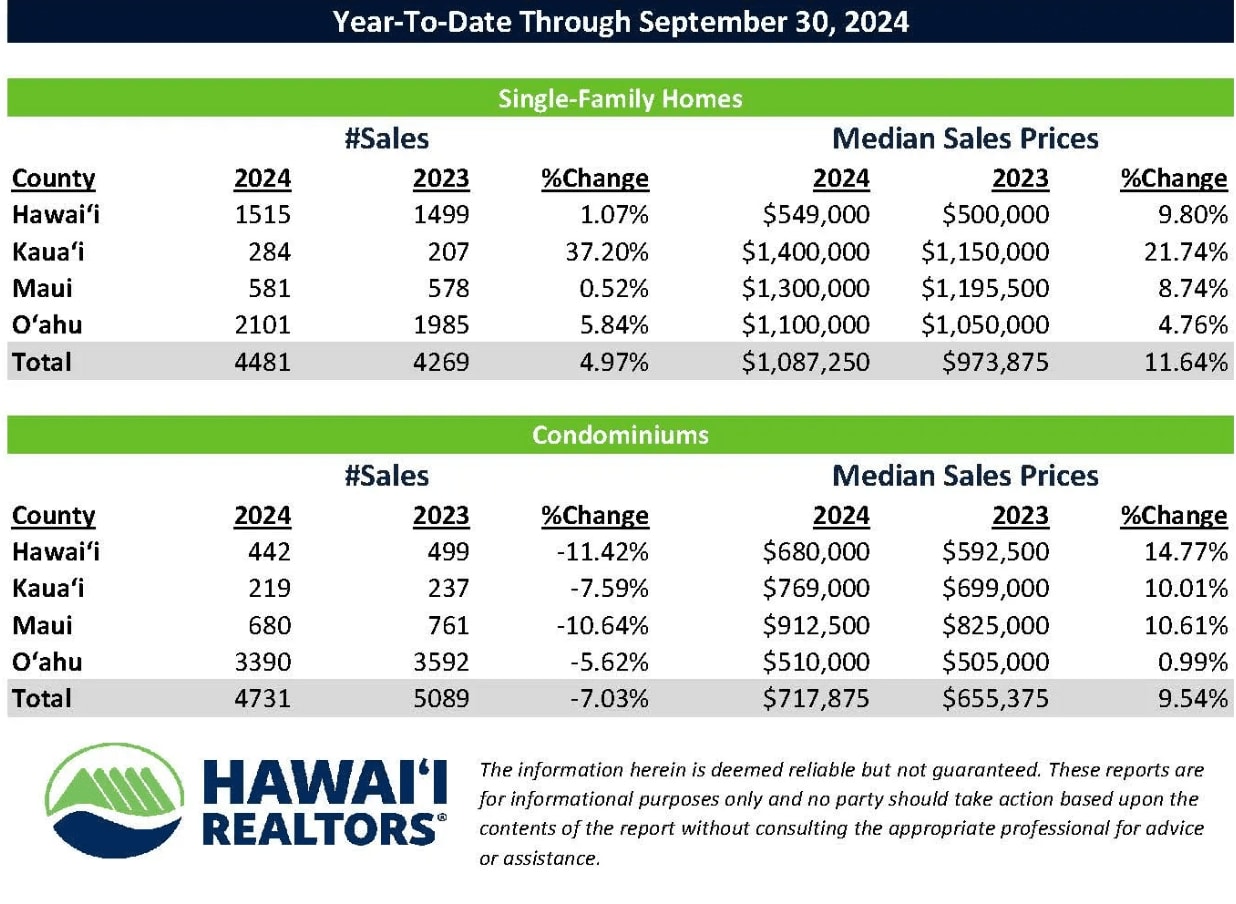 Oahu, Maui and Big Island Real Estate Year-To-Date 2024 vs 2023
