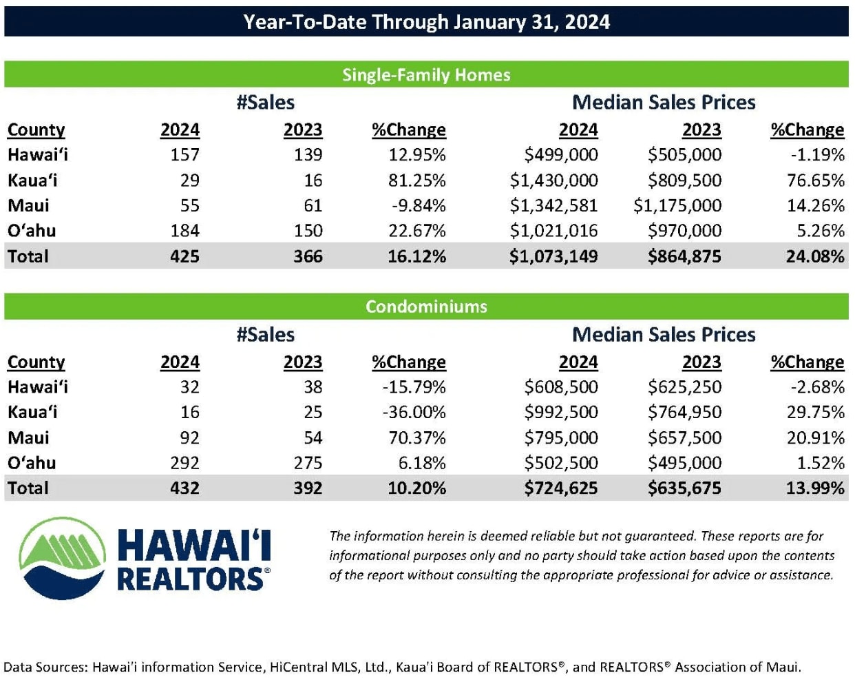 Oahu, Maui and Big Island Real Estate Statistics 2024 vs 2023