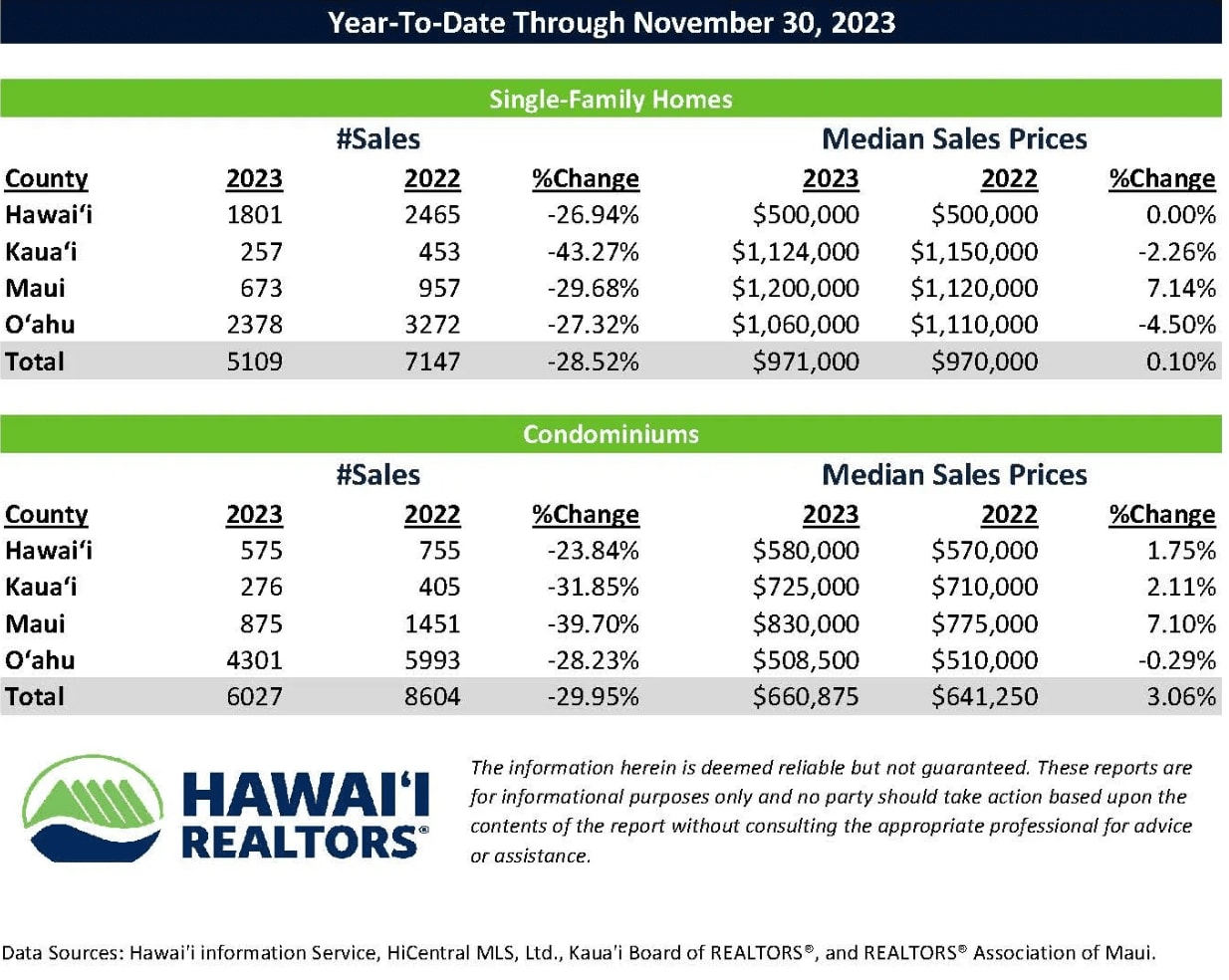 Oahu, Maui and Big Island Real Estate Year To Date 2023 vs 2022