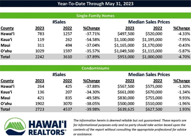 Oahu, Maui and Big Island Real Estate Year To Date, 2023 vs 2022