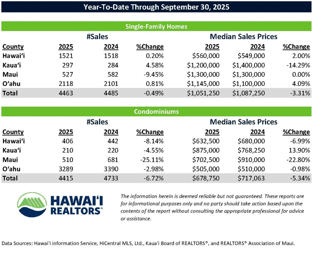Oahu, Big Island and Maui Real Estate Year-To-Date 2024 vs 2025