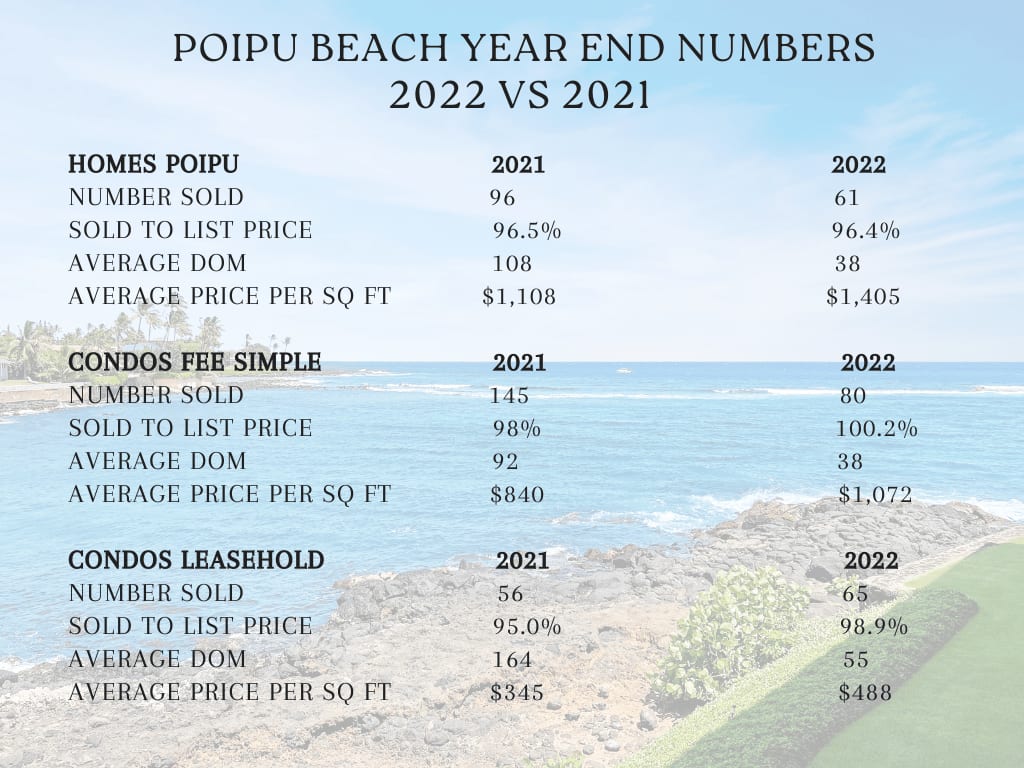 Poipu Beach Real Estate Update- When interest rates went up in May of 2022 real estate came to a standstill as Buyers and Sellers settled into the new market conditions. I stayed focused on the numbers and what was interesting is when you first looked at condo market for the South Shore it went down -3.36% but this is not the whole story. When I backed the Kiahuna Plantation and Sunset Kahili leasehold sales out of the equation the numbers aligned with what I’m seeing for the rest of the island. The graph I have provided breaks down the Residential Home Sales and separates the Fee Simple from Leasehold Numbers for the year 2022.